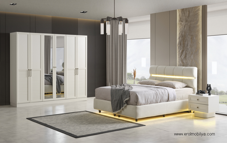 Ürüne Ait Parça Adetleri : 6 Kapılı Dolap, Şifonyer + Aynası, 2 Adet Komodin, Başlık, PUF Bu Üründe Başlığa Uygun Baza ve Yatak Ölçüsü : 150 cm * 200 cm veya 160 cm * 200 cm dir(Yaylı Yatak ve Baza Fiyata Dahil Değildir) * TSE |