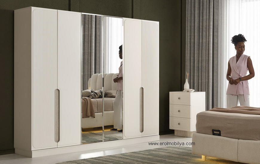 Ürüne Ait Parça Adetleri : 6 Kapılı Dolap, Şifonyer + Aynası, 2 Adet Komodin, Başlık , Çamaşırlık Bu Üründe Başlığa Uygun Baza ve Yatak Ölçüsü : 150 cm * 200 cm veya 160 cm * 200 cm dir(Yaylı Yatak ve Baza Fiyata Dahil Değildir) * TSE |
