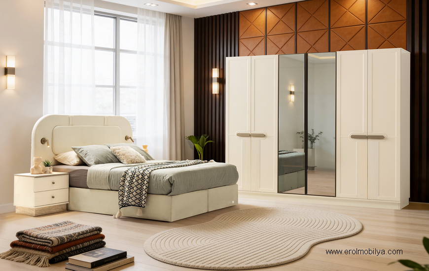 Ürüne Ait Parça Adetleri : 6 Kapılı Dolap, Şifonyer + Aynası, 2 Adet Komodin, Başlık Bu Üründe Başlığa Uygun Baza ve Yatak Ölçüsü : 150 cm * 200 cm veya 160 cm * 200 cm dir(Yaylı Yatak ve Baza Fiyata Dahil Değildir) * TSE |